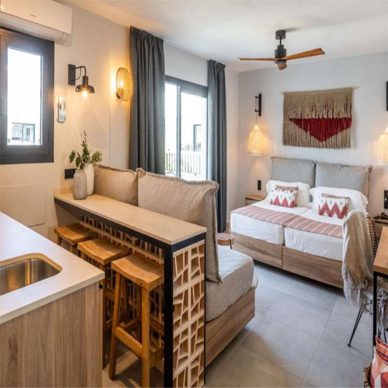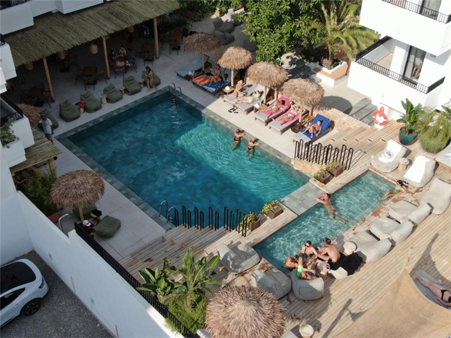 This modern adults-only aparthotel is located in Sant Antoni, Ibiza — a short stroll (≈ 600 m) from the beach and with easy access to the town centre, bus station, harbour and nightlife. It combines the privacy and flexibility of apartment-style accommodation with hotel-like amenities and a lively, social atmosphere.