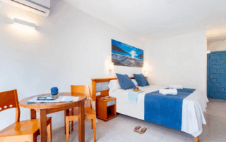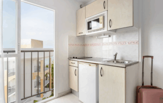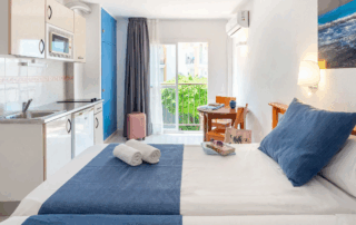 Some studios feature a balcony; some offer sea views (not guaranteed). Others have internal view or no view.