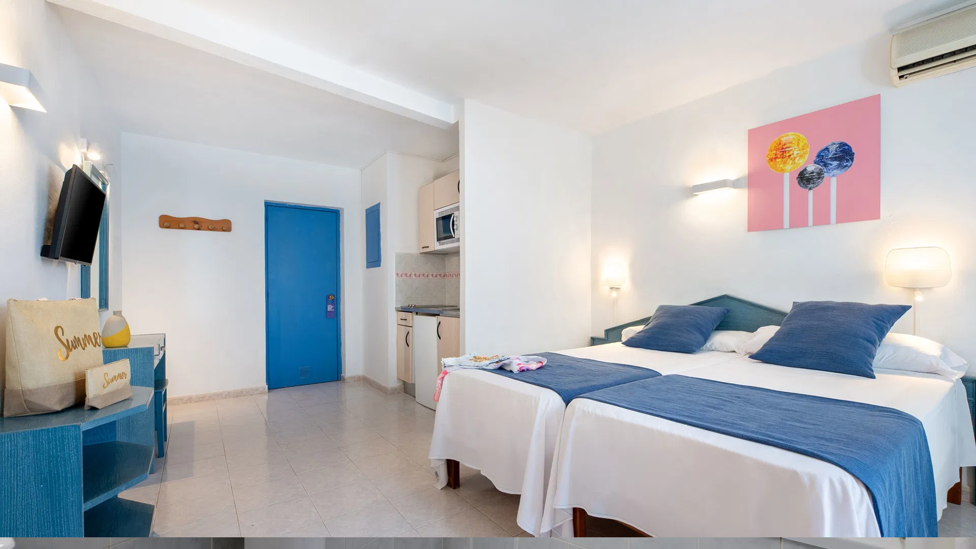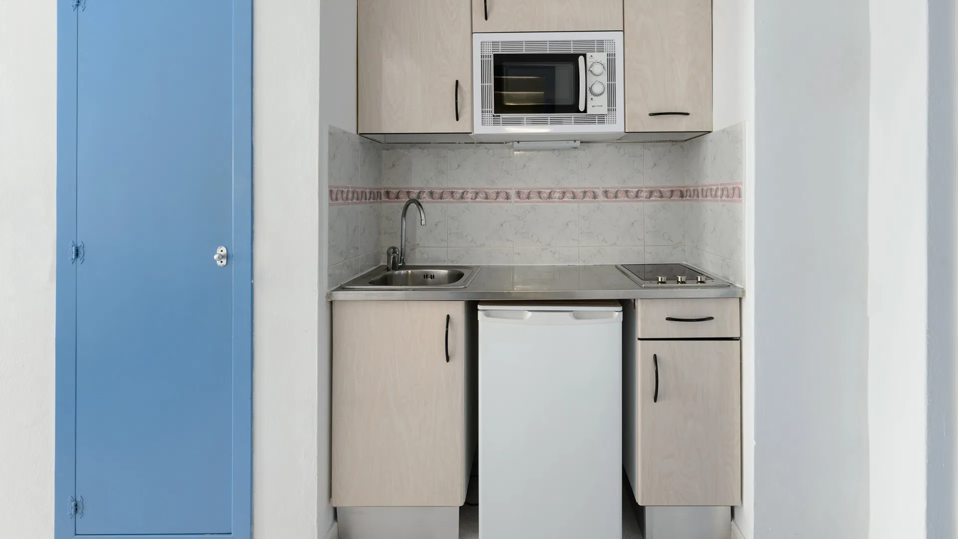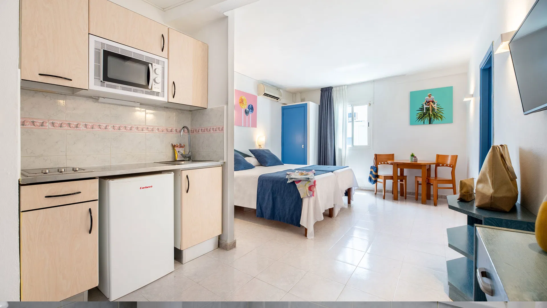 This holiday studio apartment accommodates up to 3 adults and it's fully equipped with a kitchenette, fridge, microwave, TV, and Wi-Fi. The apartment does not have a private balcony.